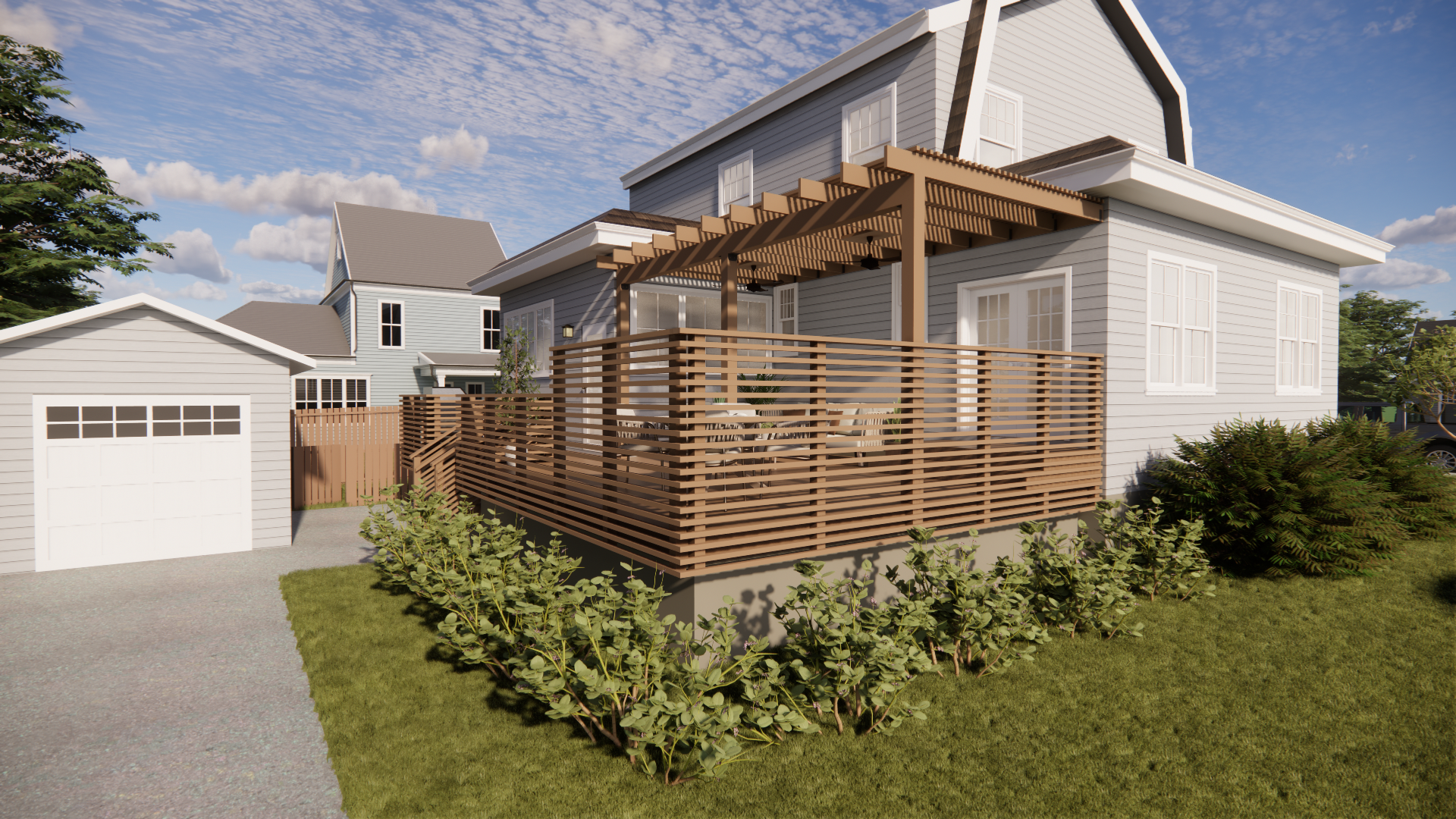 For the exterior, the clients were seeking a single-level outdoor space that offered greater flexibility and improved day-to-day functionality. The original decks and hardscaping will be removed and replaced with a larger, more usable environment designed for family life and entertaining. While the home’s architecture is classic, the clients requested a more modern outdoor aesthetic as a purposeful juxtaposition to the traditional exterior. The resulting design offers a clean, modern outdoor experience—with integrated sun and shade elements, thoughtful privacy screening, and intentional spatial planning—well suited to their corner lot and the vibrancy of the surrounding neighborhood.